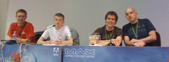 Still, once inside the dimly lit and slightly tradesman-like entrance, the venue was an immense spectacle of Max banners and video screens, with the main auditorium one of the largest I’d ever seen at a Flash conference (Of course, someone had to point out that the American one was waaaay bigger..)